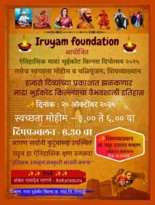 माढा,प्रतिनिधी :-शरद भांगे,दीपावलीच्या शुभमुहूर्तावर माढा शहरातील ऐतिहासिक भुईकोट किल्ला येथे इरूयाम फाऊंडेशन – हेरिटेज ऑफ ह्युमॅनिटी तर्फे स्वच्छता मोहीम, ऐतिहासिक व्याख्यान आणि दीपोत्सव सोहळा मोठ्या उत्साहात पार पडला. सोमवार, दि. २० ऑक्टोबर रोजी आयोजित या उपक्रमाला माढा व परिसरातील नागरिकांनी उत्स्फूर्त प्रतिसाद दिला.